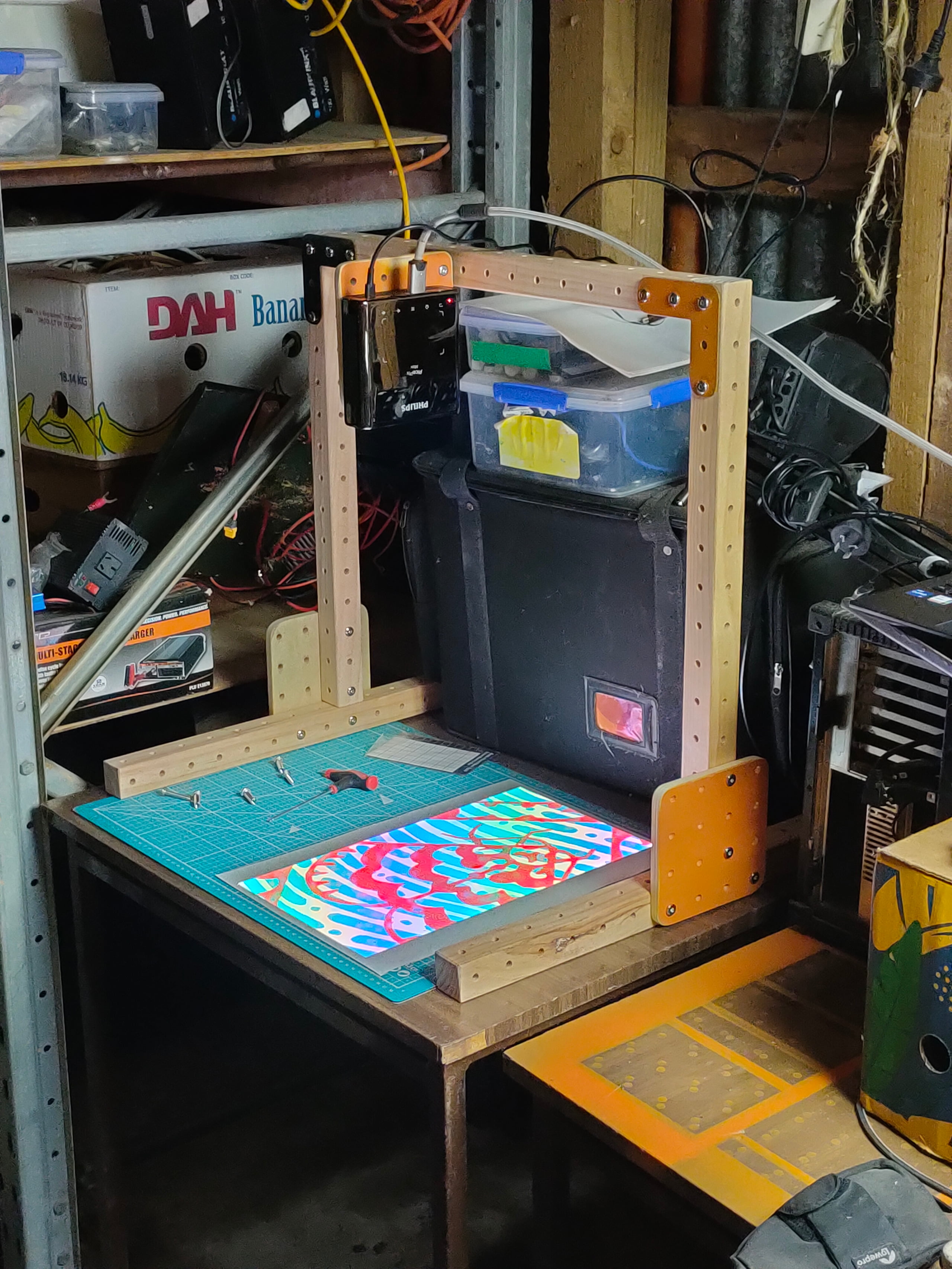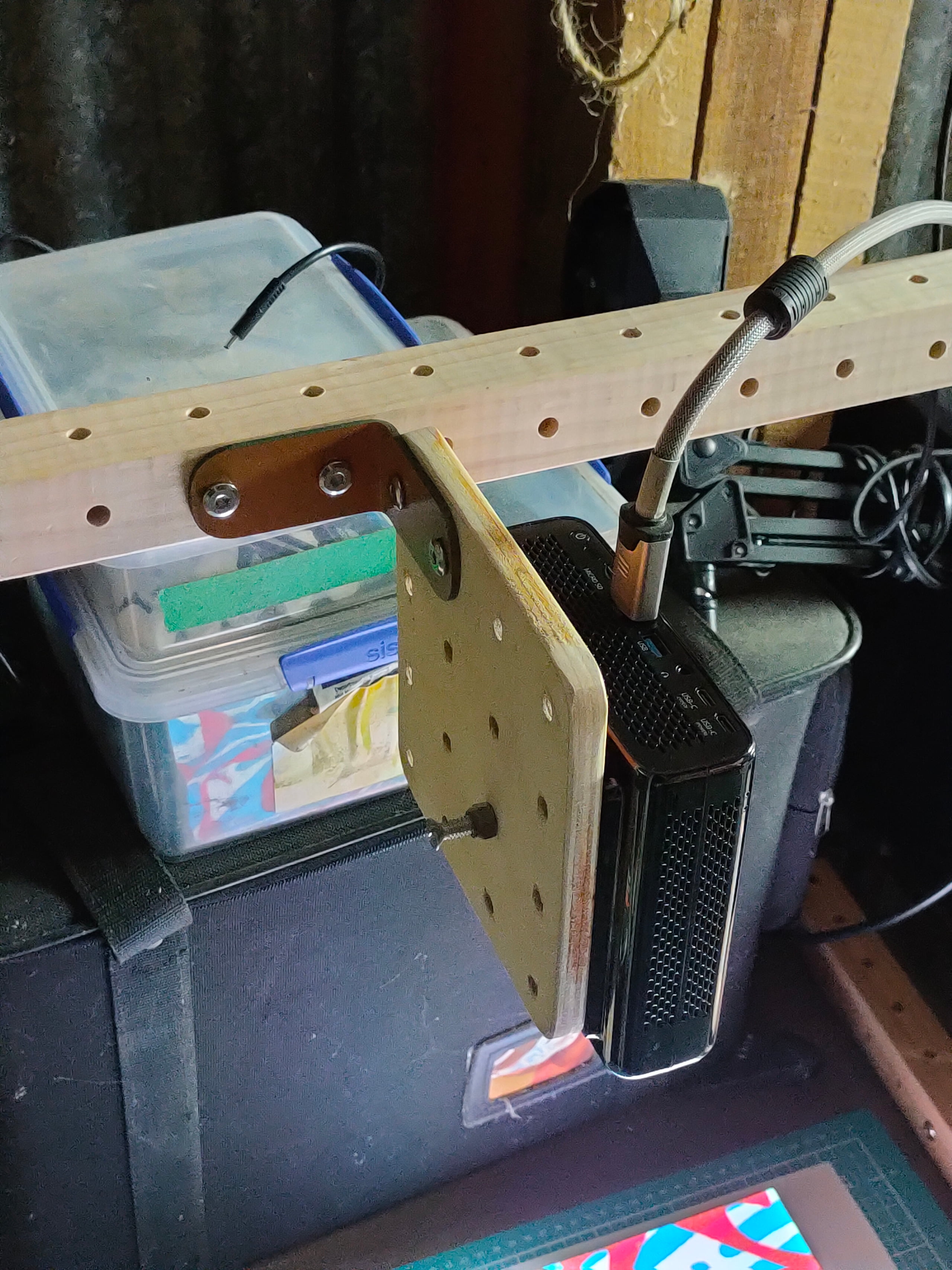 projector mounted closer to the desktop by adjusting where the bracket is attached to the 4x4 panel